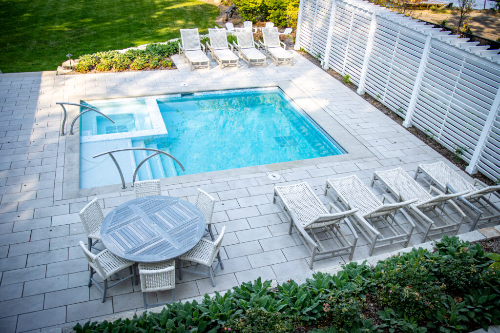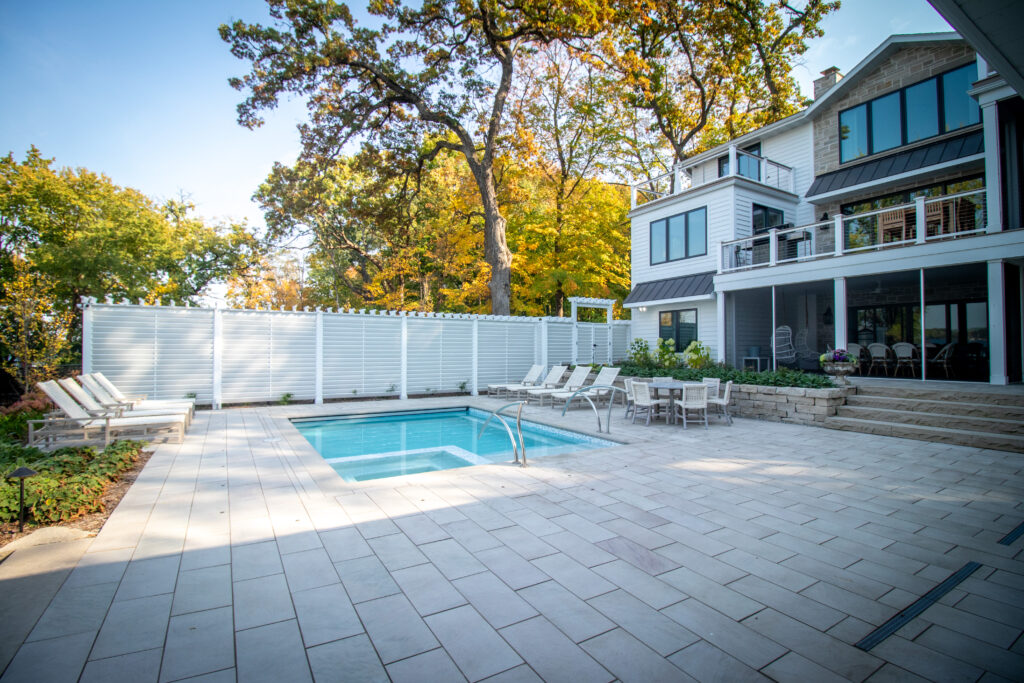 However, the existing landscape lacked function, organization, and visual appeal. It also offered little connection to the lake. Meanwhile, strict shoreland zoning and setback regulations guided structural decisions. These constraints dictated the placement of terraces, retaining walls, and the pool complex. In addition, a five-foot grade change across the build zone required two retaining walls and precise drainage solutions. Carefully placed trench drains protected the level pool deck and pool house. At the same time, construction occurred during a major home remodel. Therefore, the project required careful access management and close coordination among multiple contractors.